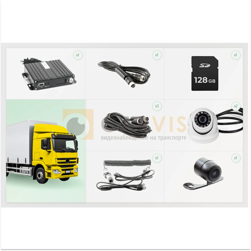 Предложенный комплект представляет собой стандартное решение для крупнотоннажного грузовика. В зависимости от конкретных потребностей вашей организации и особенностей транспортных средств, возможно создать индивидуальный комплект видеонаблюдения.